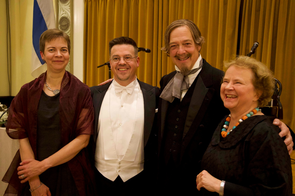 Kuvassa (alla) Väitöskaronkka-tilaisuudesta Ostrobotnialta vastaväittäjä Kati Parppei, Teppo Ylitalo, karonkassa vieraillut Zachris Topelius (Riko Eklundh), kustos professori Laura Kolbe.