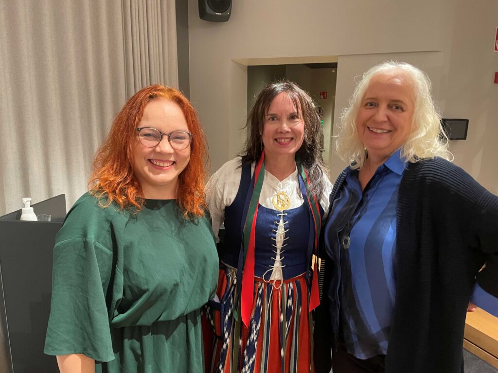 Kuvissa Kaisu Tuokko, kolmikko (vasemmalta oikealle) Kaisu Tuokko, Otavan tietokirjallisuuden kustannuspäällikkö Mari Mikkola – komiasti Jurvan kansallispuvussaan, sekä Maarit Tastula.